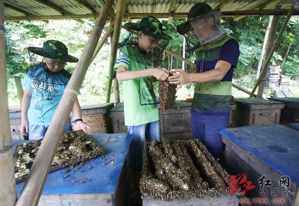 当下正值暑假,家长们纷纷利用这一时机带领孩子前往农家、农庄消暑休闲、体验生活。图为桥头河镇石狗一养蜂场吸引小游客体验养蜂。(张扬 摄影报道)