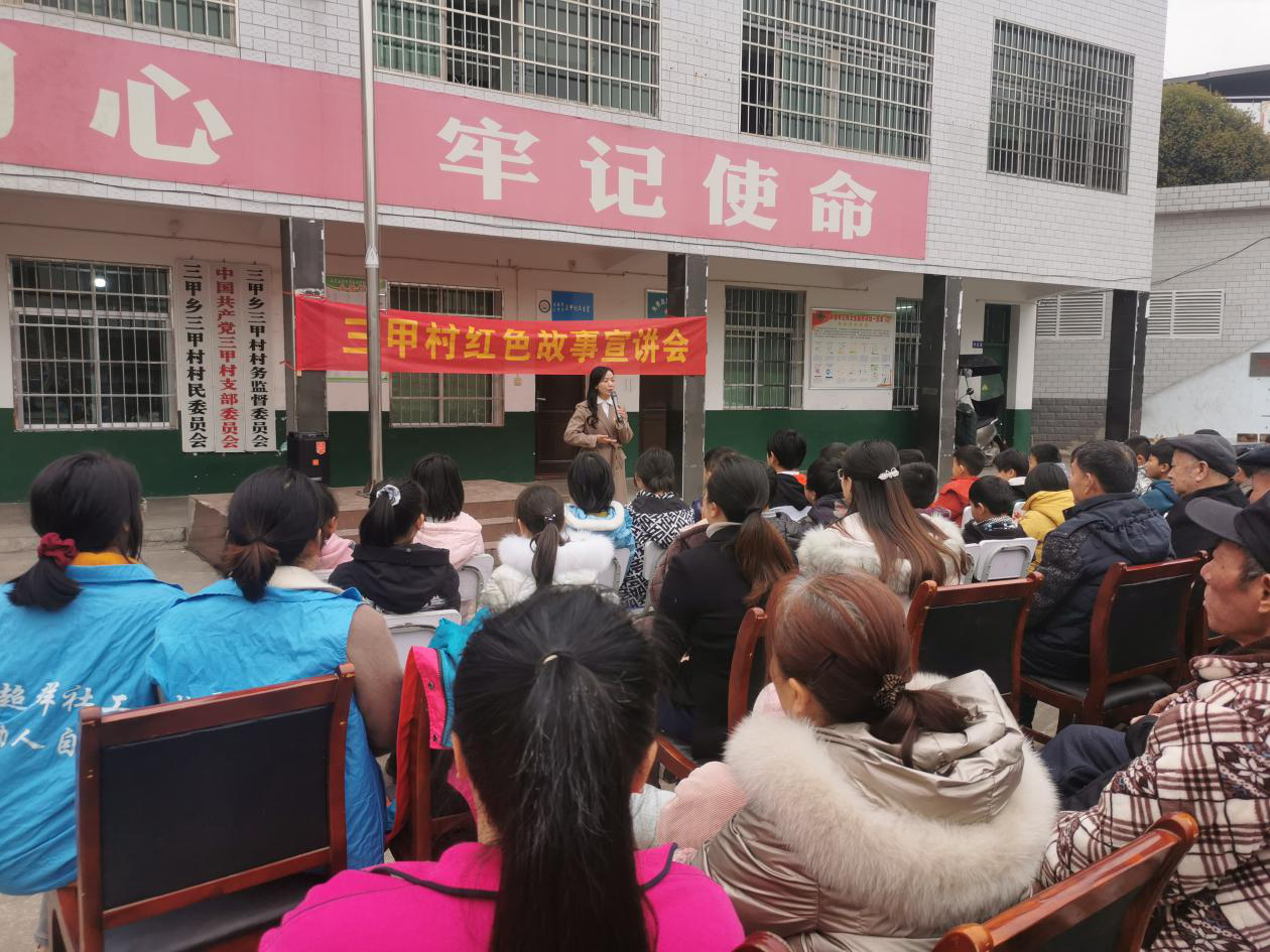 (图:三甲村的党员、群众、学生代表认真倾听红色故事)