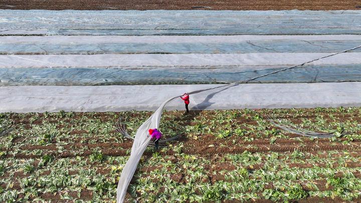 △2025年12月11日,山东东营广饶县,农民为作物覆盖防寒无纺布。